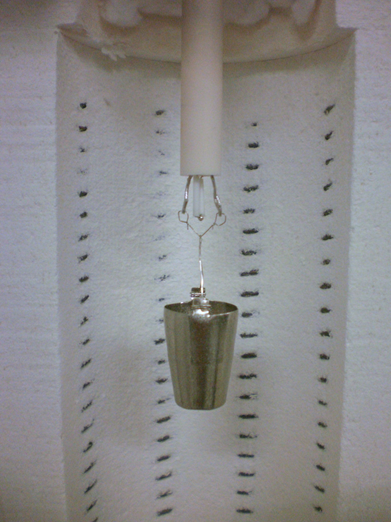 ガラス試料は白金ルツボに入れて写真のように白金線で吊り下げます.二本の吊線に30V程度の電圧を通電させて溶断し,炉の真下に置いた冷却水入りのビーカーに落下急冷します.