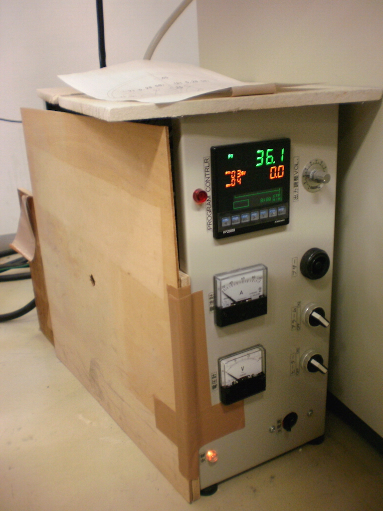 MoSi2炉のコントローラー.トランス,PID制御器,サイリスタ,電流計,電圧計を組み合わせた自作品.ケースは廃棄物を再利用しました.