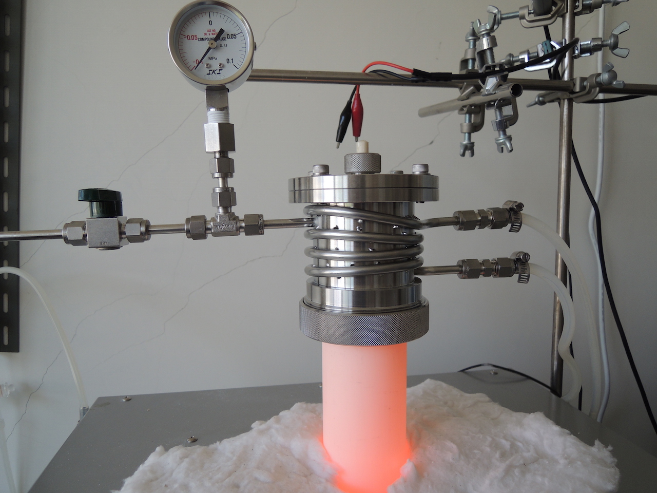 上側の真空水冷フランジです.この改良によりガラスを真空溶融したり,ガス混合して雰囲気制御ができるようになりました.