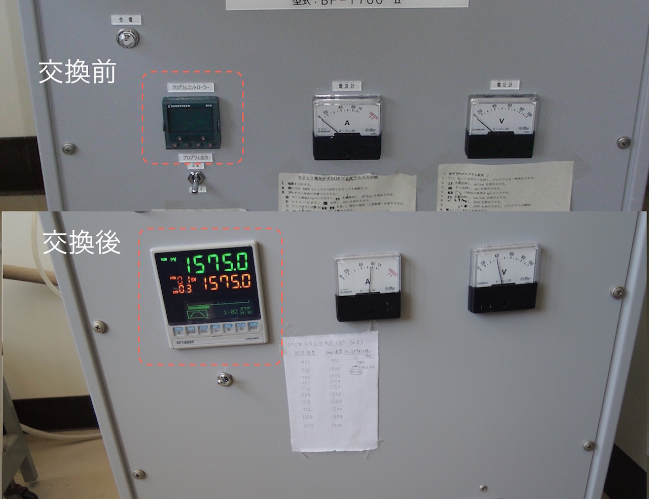 オリジナルのユーロサーモ製のPID制御器をCHINO KP-1000に交換しました.ルーチンワーク的な加熱ならユーロサーモでも良いのですが,研究用途では加熱途中のプログラム変更が頻繁に発生するので,そのような場合にはCHINOの方が使いやすいです.サイリスタも対応版に交換しています.