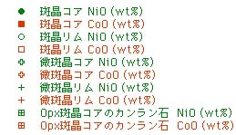 0.1vol%含まれる.微斑晶(70μm 以下)はFa成分に富みピジョン輝石の反応縁を有する. 斜方輝石の反応縁を伴うカンラン石はコアがFo成分に富み,クロムスピネルおよび斜長石を包有することがある.