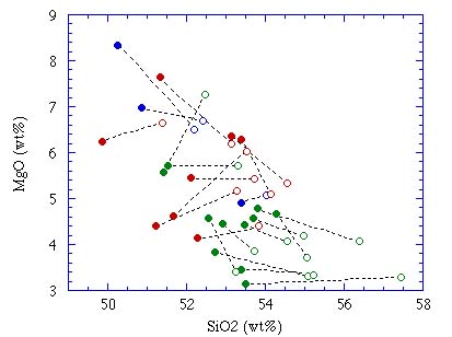 ![]() | 凡例 &ref(): File not found: "bkgrleg.jpg" at page "data"; 全岩と石基を結ぶ点線は同一のサンプルであることを示す 全岩と比較して石基がMgOに乏しいサンプルと石基がMgOに富むサンプルがある |