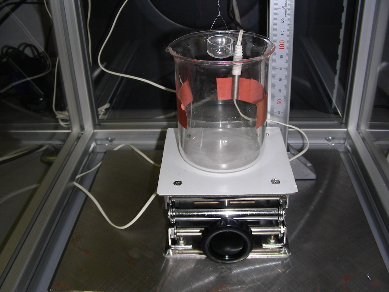 物質を溶液に沈めたときに生ずる浮力はその物質の体積と溶液の密度の積に等しくなります(アルキメデスの法則).従って,空気中の物質の重さと密度既知の溶液中での重さの差から浮力を求めれば,その物質の体積を決定することができ,体積を物質の質量で割れば密度が求まります.この原理でガラスの密度を測定する装置です.