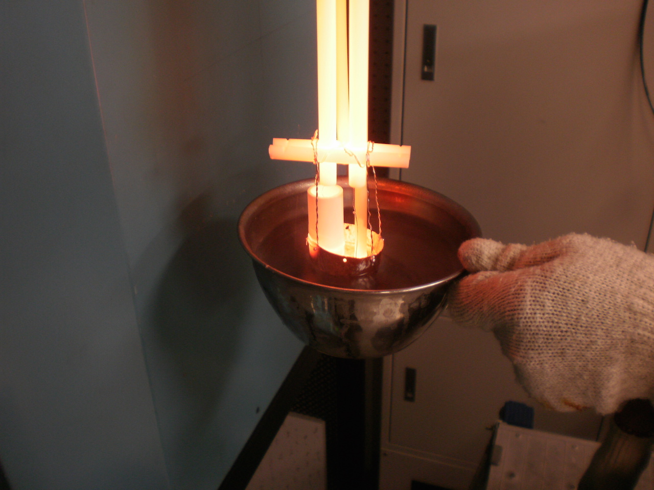 写真は滋賀県大で用いていた起電力測定セルです.実験後にセルを水冷している様子.