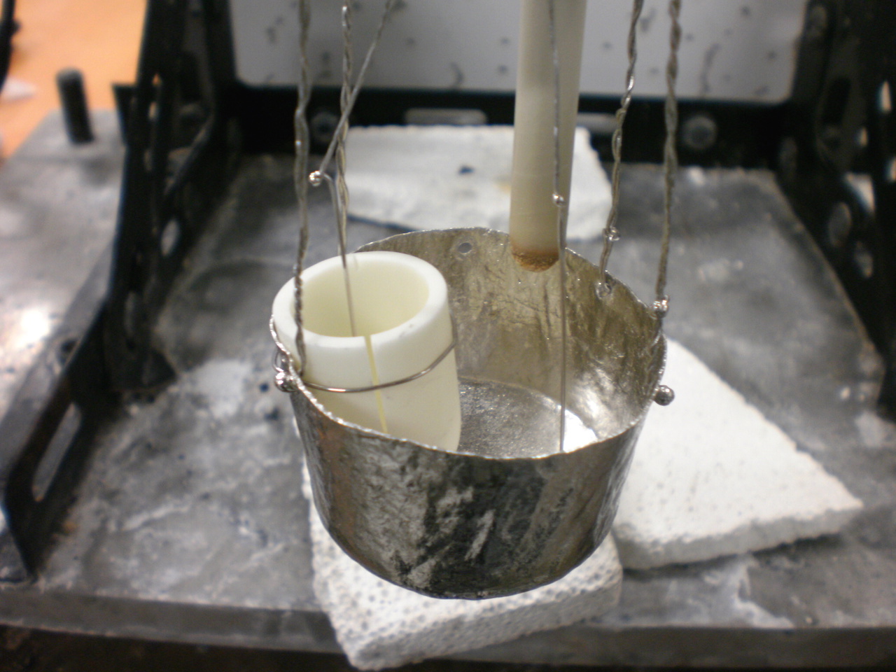 アルミナタンマン管(ニッカトー SSA-S)にSiO2-Al2O3-Na2O系の参照ガラス試料,白金ルツボに測定ガラス試料を入れます.濃淡電池の起電力は白金電極近傍のNa2Oの濃度差で決まります.参照試料はAl2O3を含んでおり,また測定試料側の電極はアルミナタンマン管から距離的に離れているため,アルミナタンマン管の溶出に伴う拡散は測定には影響しません.なお参照メルトと測定メルトを接触させる目的でタンマン管に切り込みが入れてあります.<br> 以前の研究では塩橋を構成したり,βアルミナ固体電解質などが使用されてきましたが,写真のような単純なセルでも十分に高精度な測定が可能です