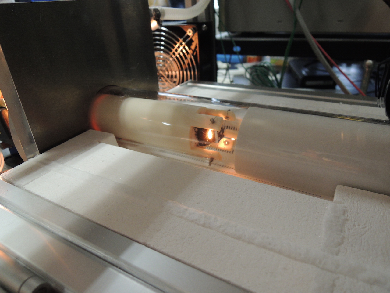 加熱炉の炉心管に石英管を使用し,試料への光の照射具合が観察できるようにしました.
