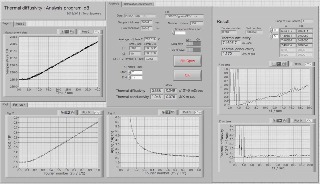.本装置では小林・熊田(1967, 原子力学会誌, 9, 58-64)の方法により,試料表面と裏面の輻射熱損失の影響を考慮した解析法を採用しています.この解析法では試料の密度と比熱も用いて熱伝導率も同時に求まります.