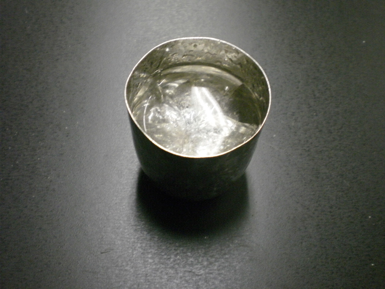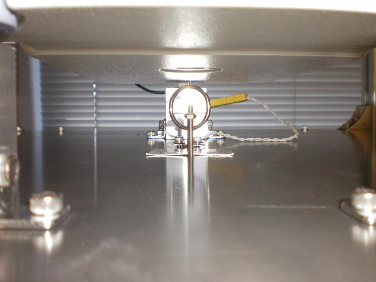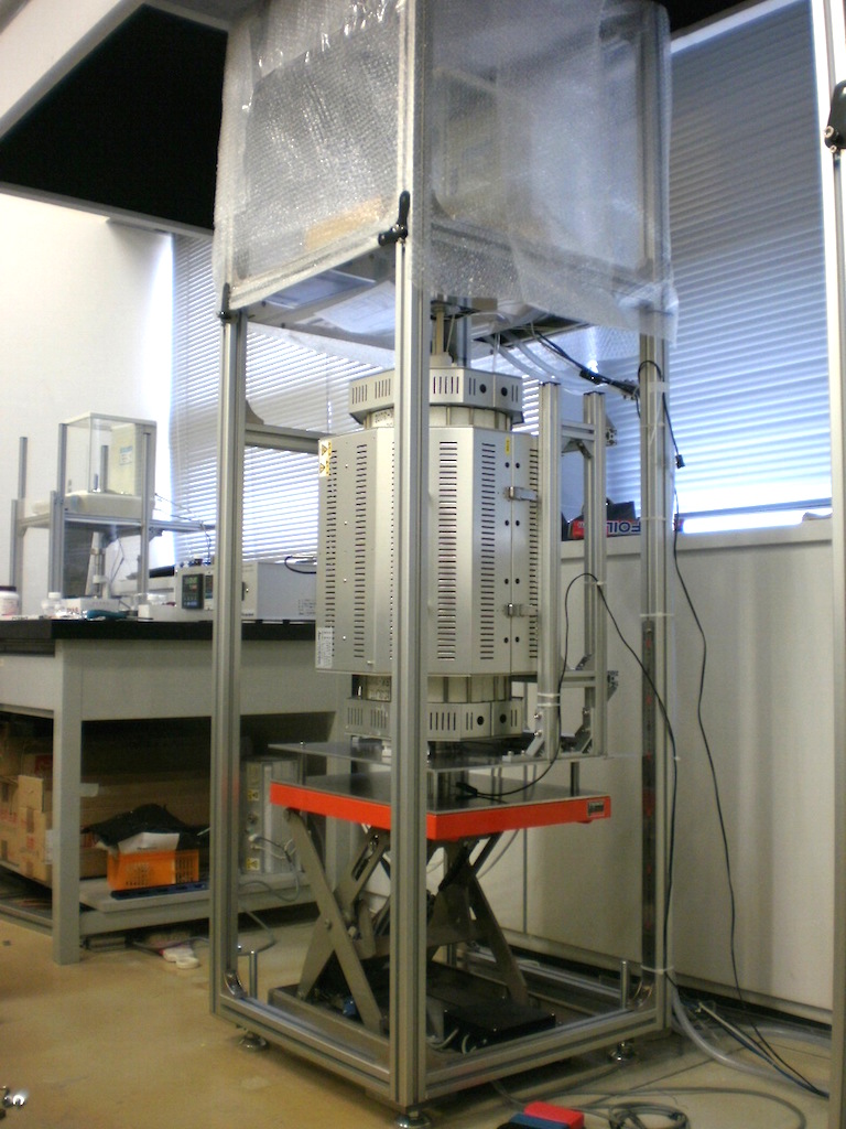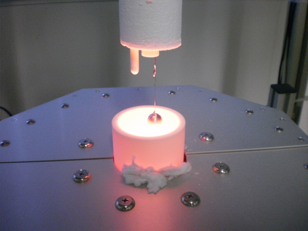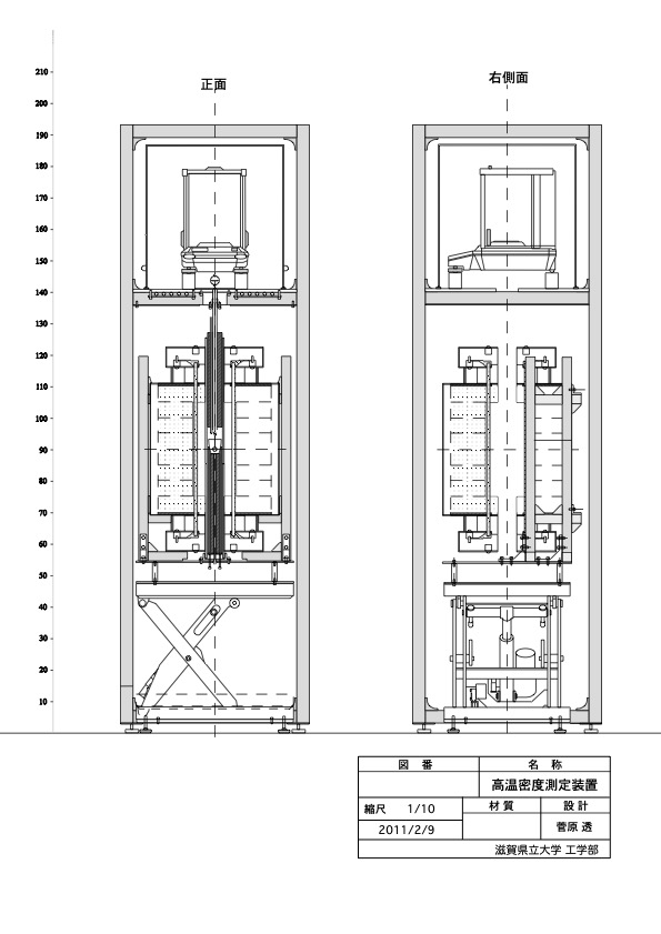 白金ルツボに入れた溶融試料中に体積が異なる大小ニ個の白金球をそれぞれ沈め,浮力を測定します.それらの差をとると吊線にかかる表面張力がキャンセルされ,アルキメデスの法則に従って溶融試料の密度が求まります.この方法は「アルキメデス二球法」と呼ばれています.