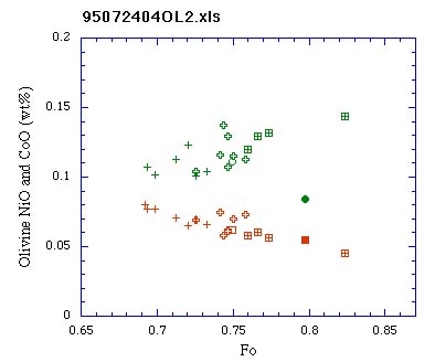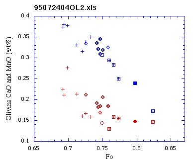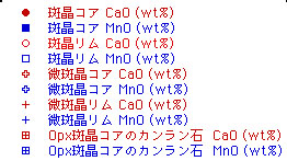 0.1vol%含まれる.微斑晶(70μm 以下)はFa成分に富みピジョン輝石の反応縁を有する. 斜方輝石の反応縁を伴うカンラン石はコアがFo成分に富み,クロムスピネルおよび斜長石を包有することがある.