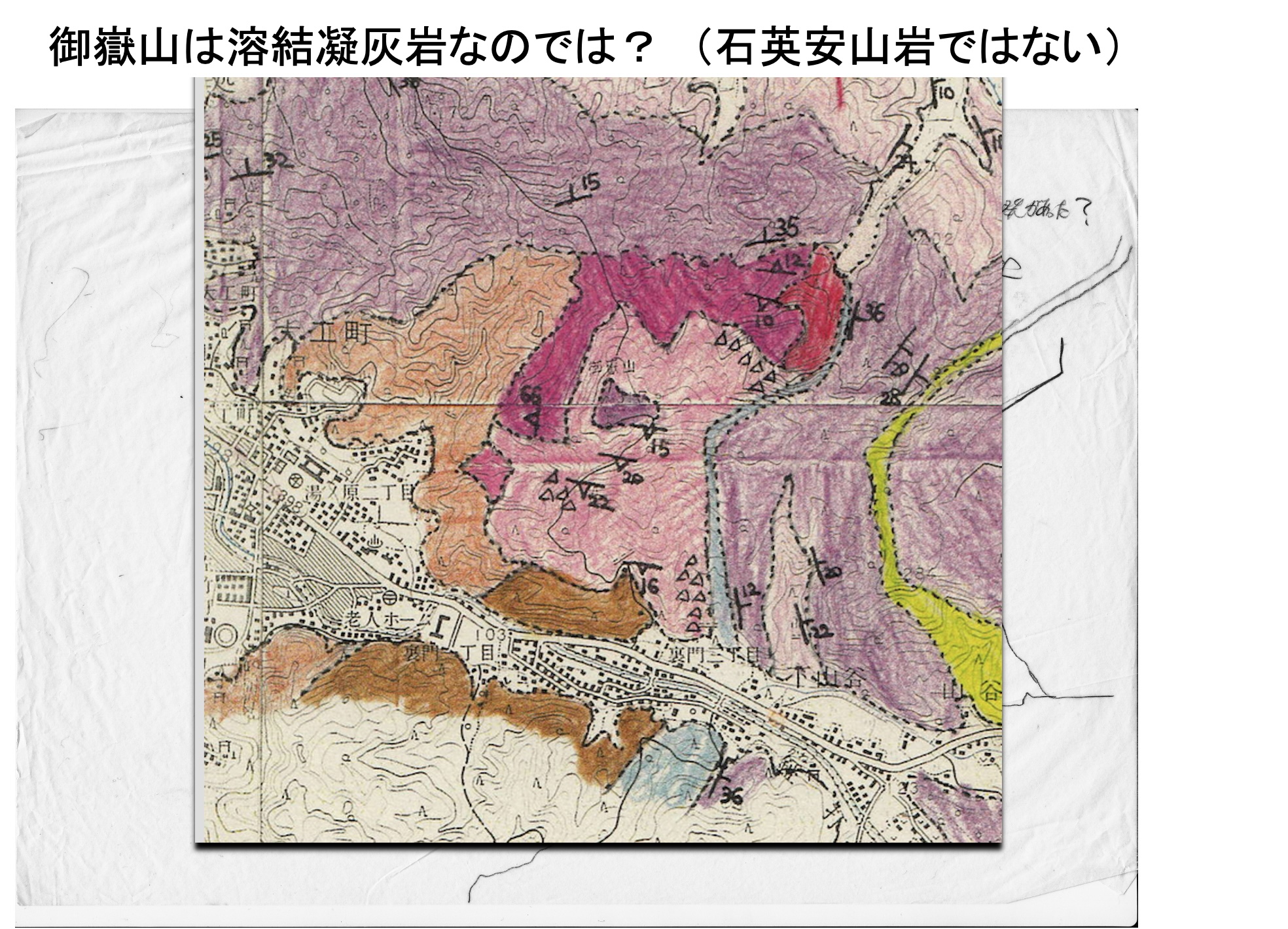 御嶽山の周辺は狭い地域に多くの種類の岩石が露出する難しい地域で
