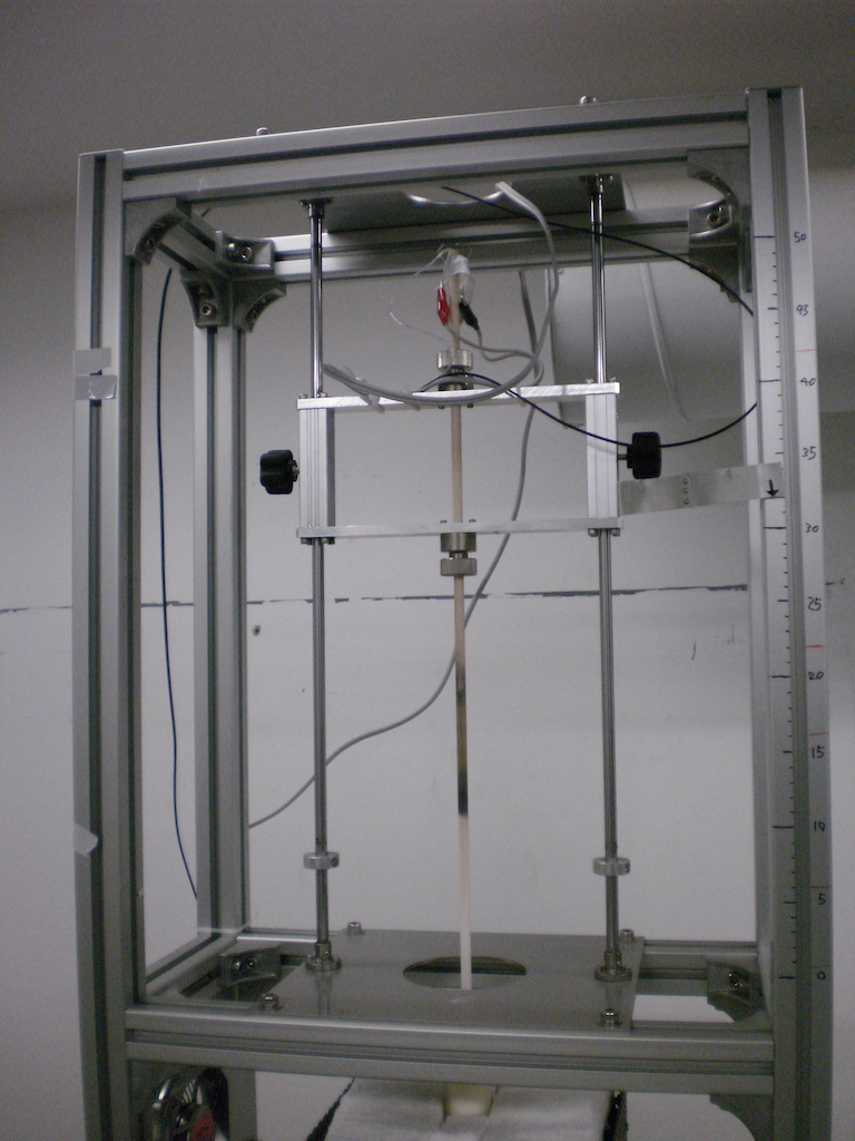 ガラス試料は白金ルツボに入れて写真のように白金線で吊り下げます.二本の吊線に30V程度の電圧を通電させて溶断し,炉の真下に置いた冷却水入りのビーカーに落下急冷します.