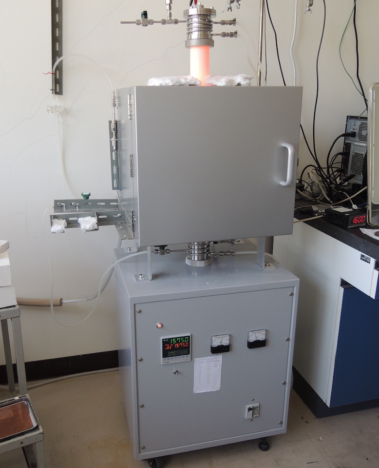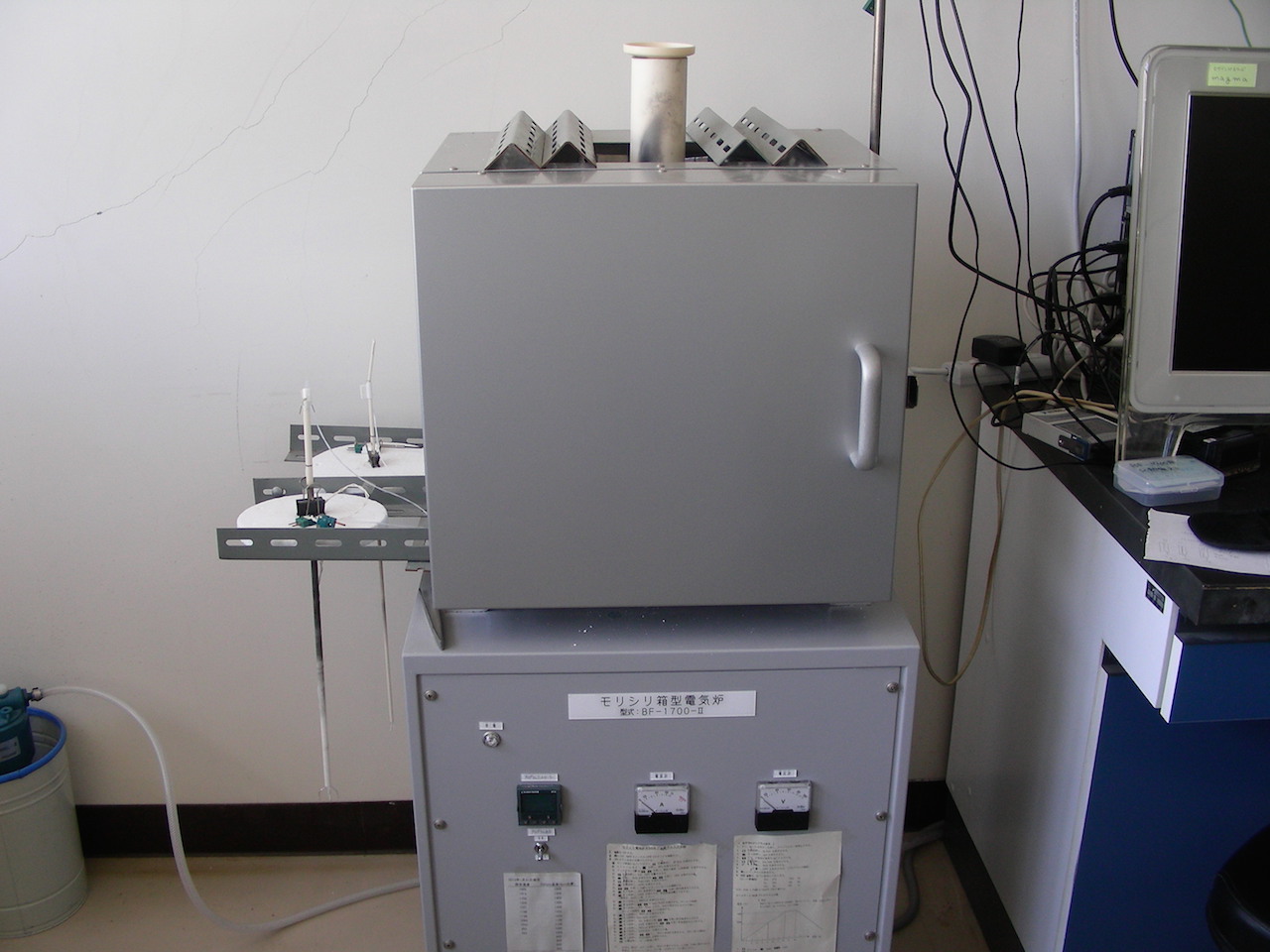2013年に上部の断熱材に穴を開けて炉心管を縦に設置できるようにしました.製造元のクリスタルシステム社はこのような改造にも臨機応変に対応してくれます.箱型炉では1300℃以上の温度では輻射が強すぎて,温度を上げた状態では扉を開けての試料の出し入れが困難になります.縦置き炉心管があればワイヤーループ法で相平衡実験をしたり,1300℃以上の温度でも試料を取り出して急冷したりできます.