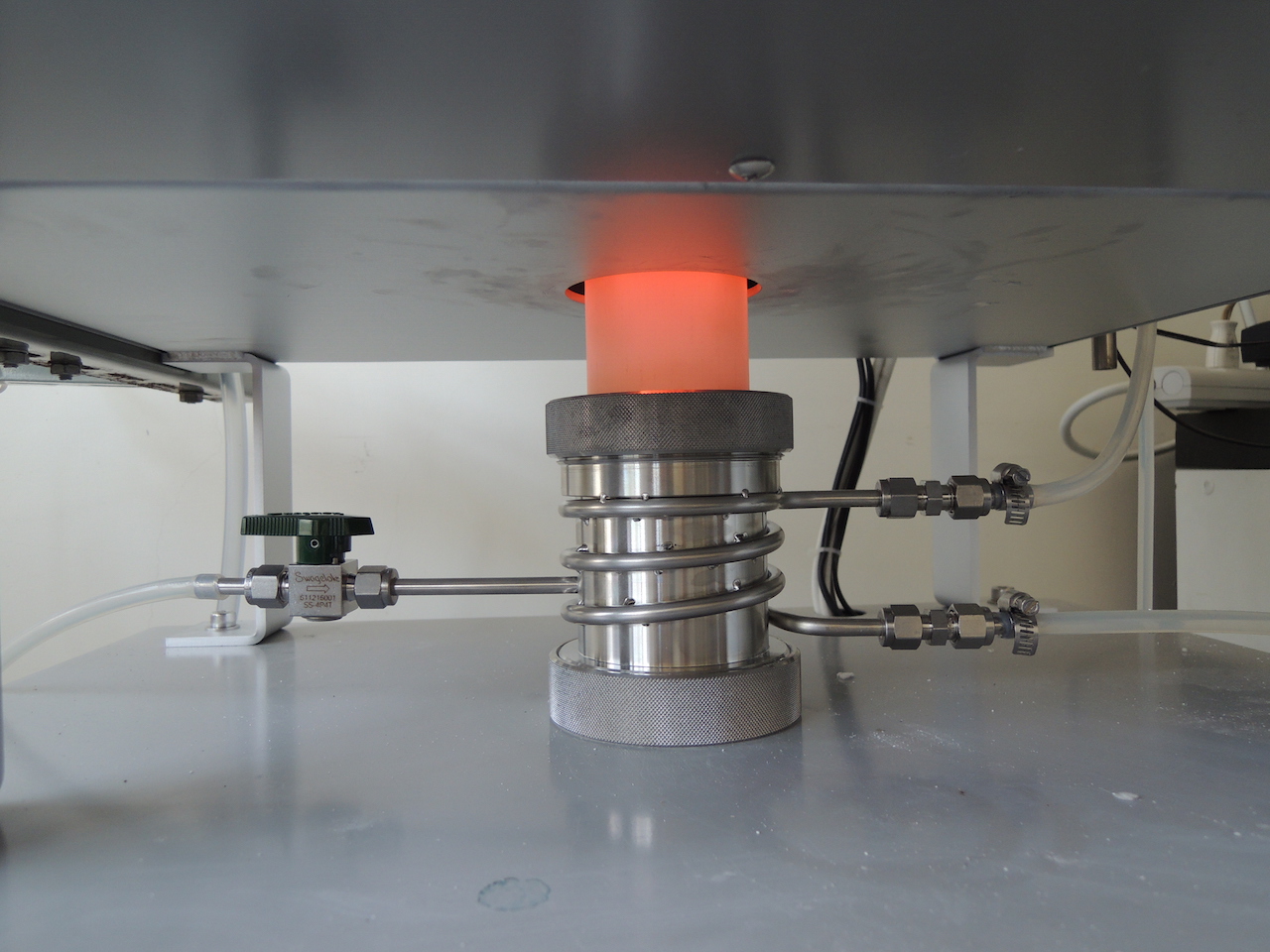 上側の真空水冷フランジです.この改良によりガラスを真空溶融したり,ガス混合して雰囲気制御ができるようになりました.