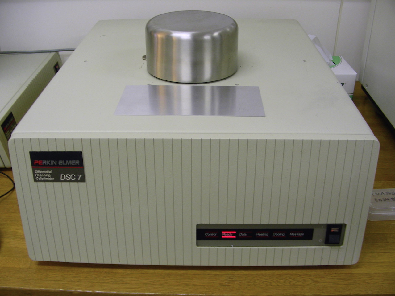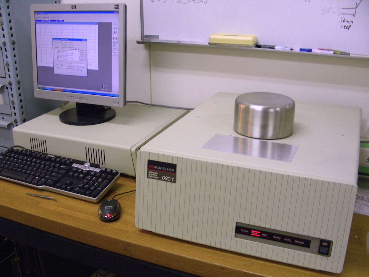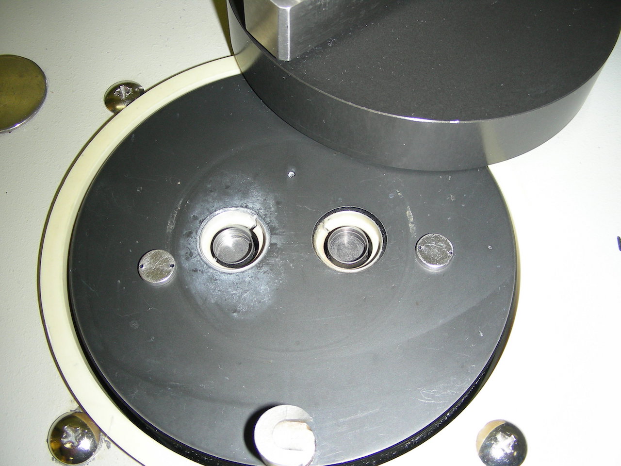 DSC検出器です.DSC7は30年前の装置ですが,検出器の構造は最新のPerkin-Elmer製DSC(例えばPyris)とほとんど同等で遜色ありません.現在はDSCと言えば熱電対で温度差を検出する熱流束型が主流ですが,かつてはこの入力補償型センサーのことをDSCと呼んでいました.熱流束型DSCは検出器の構造が単純なため安価ですが,入力補償型と比較して測定精度は劣ります.入力補償型DSCを製造しているのは,現在ではPerkin-Elmer社のみです.