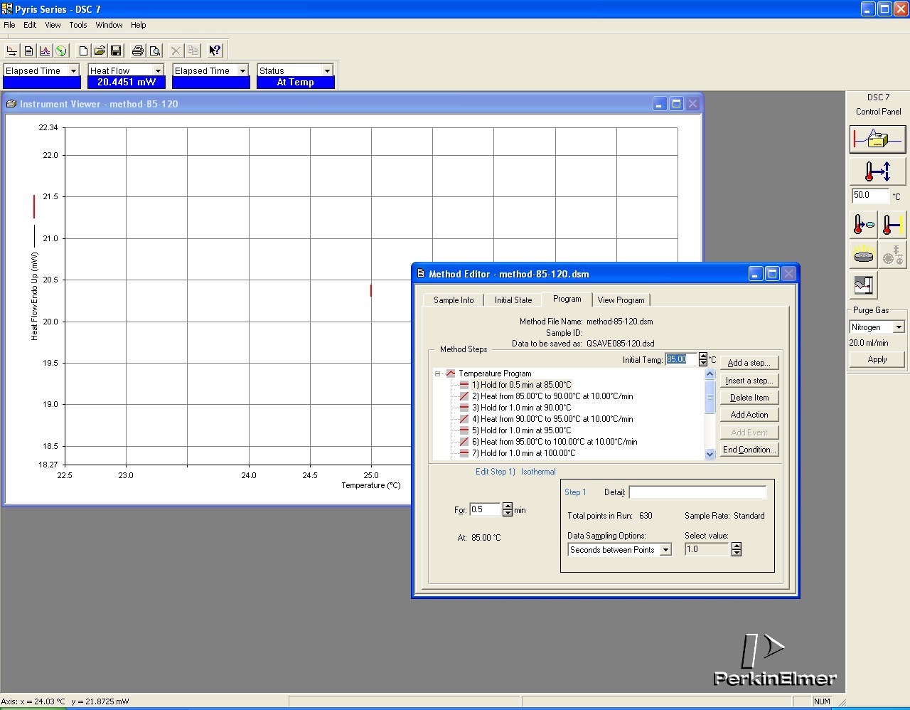 古い装置の欠点は最新の計測プログラムが使用できないことです.このDSC7では2006年のPyris Ver.8を使用しています.入力補償型はステップ状に加熱するStep-Scan測定を行うことで,熱流束型DSCと比較して高精度の比熱測定を行うことができます.しかしPyris Ver.8は繰り返しのステップ加熱に対応しておらず,またプログラムも最大15ステップまでしか組めません.そこで当研究室ではフリーソフトのUWSCでスクリプトを書いて,メソッドファイルを自動的に選択して繰り返すようにすることで,連続的なStep-Scan測定を行っています.