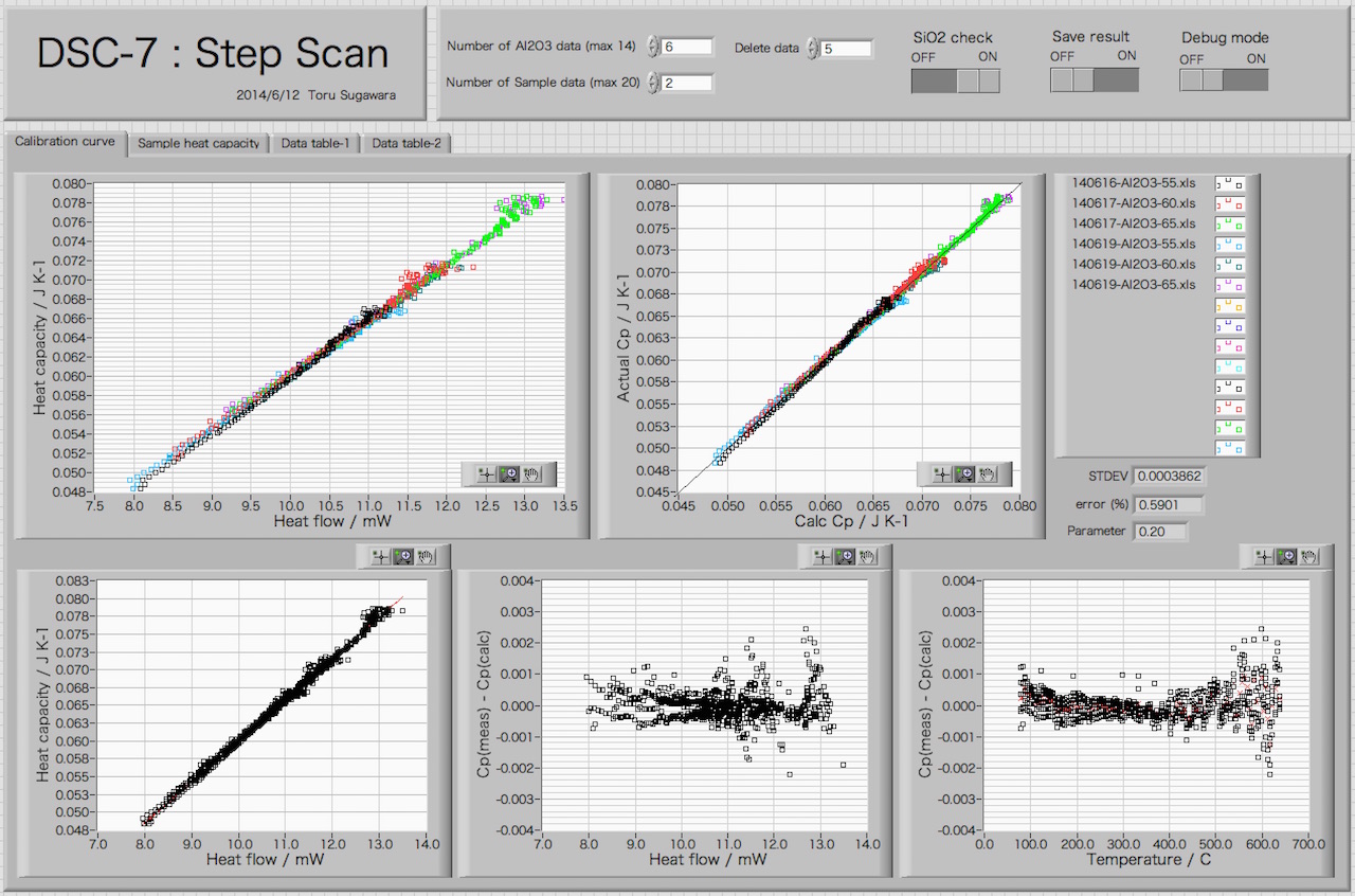 Al2O3を標準試料に用いてヒートフローと比熱の関係を求め,測定試料の測定値を校正します.Perkin-Elmer社が販売しているStep-Scanソフトウエアはとても高価ですが,測定原理さえ理解していれば解析プログラムは容易に自作できます.