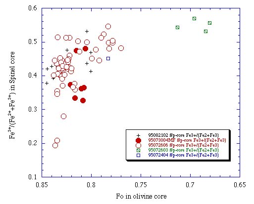 カンラン石斑晶コアのFoとスピネルコアのFe3+/(Fe3++Fe2+)量