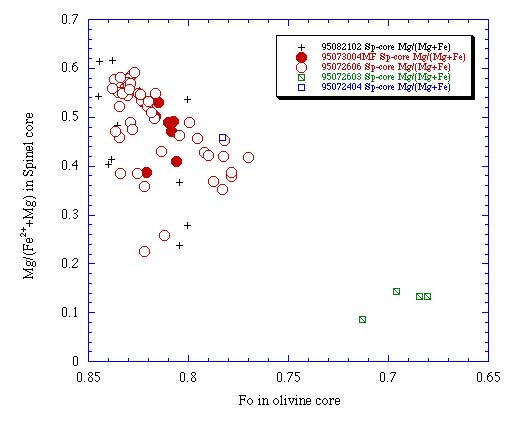 カンラン石斑晶コアのFoとスピネルコアのMg/(Mg+Fe2+)量