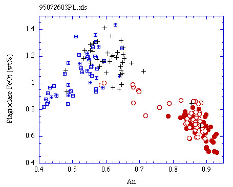 ほとんどの斜長石斑晶が単斜輝石+FeTi酸化鉱物±シリカ鉱物の組み合わせの