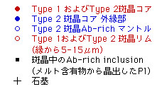 Type 1, 2の斜長石斑晶が存在する.斜長石の斑晶量は45vol%である. 単斜輝石+FeTi酸化鉱物±シリカ鉱物の組み合わせの含有物および1μm以下 の微細な結晶の集合体から構成されるメルト包有物を有し,いずれの場合も 周囲がAb-rich斜長石で被われている.微細な結晶の集合体から構成される メルト包有物はさらに円形の形状をしたシリカ成分に富むガラスを頻繁に 含む(液相不混和?).