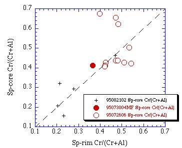 スピネルのコアとリムのCr/(Cr+Al)量の比較