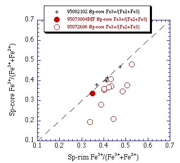 スピネルのコアとリムのFe3+/(Fe3++Fe2+)量の比較