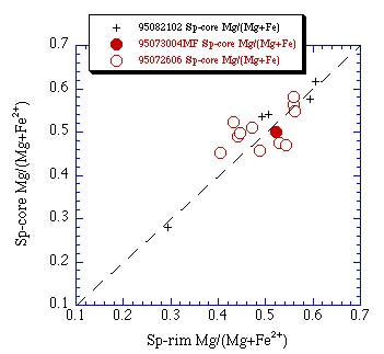 スピネルのコアとリムのMg/(Mg+Fe2+)量の比較