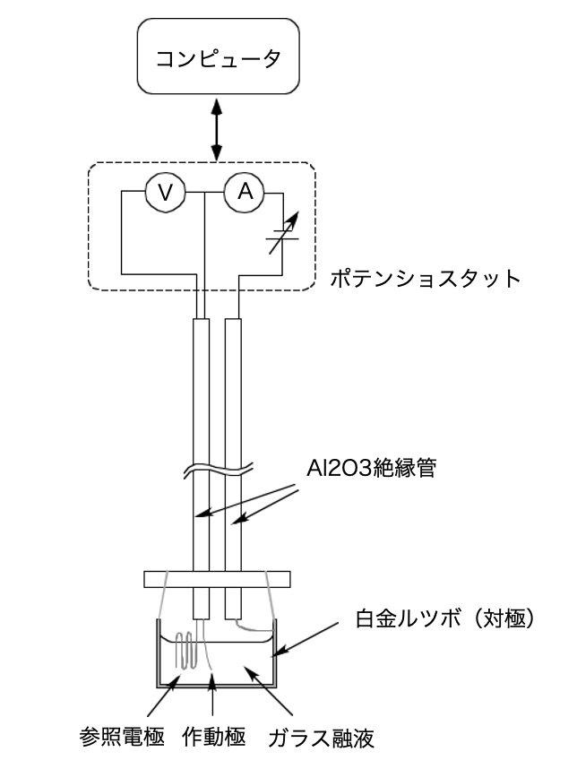 ボルタンメトリー法は高温の珪酸塩メルトにパルス状の電圧を印加しながらメルトを流れる電流を測定するものです.