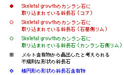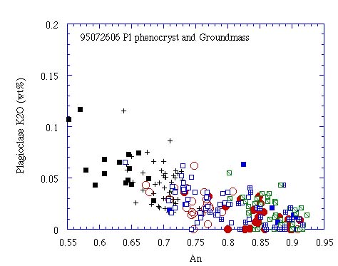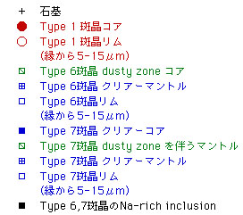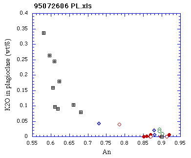 Type 1, 6, 7の斜長石斑晶が存在する.斜長石の斑晶量は33vol%であり, 斜長石全体の56vol%が汚濁帯を有する.汚濁帯は単斜輝石とガラスから成り, ガラスの周囲はAb-rich斜長石で被われている. 1-3μmの微細な結晶の集合体から構成されるメルト包有物を有する場合もあり, この場合も周囲がAb-rich斜長石で被われている.