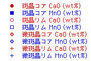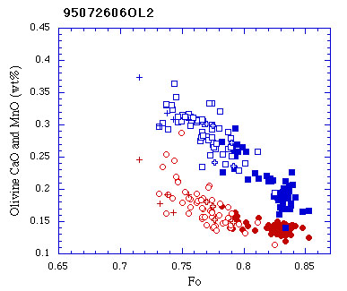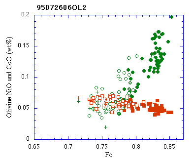 5vol%含まれる.すべてのカンラン石斑晶がクロムスピネル含有物を含む. リムはピジョン輝石の反応縁により被われている. 含有物として不規則な形状の斜長石,単斜輝石,FeTi酸化鉱物の集合物(メルト含有物が徐冷したもの), 楕円形の形状の斜長石,結晶を含まないガラス,針状の斜長石,単斜輝石を伴うガラスがある. ガラスの周囲のカンラン石はホストのカンラン石よりもCaO, FeO, MnOに富む.