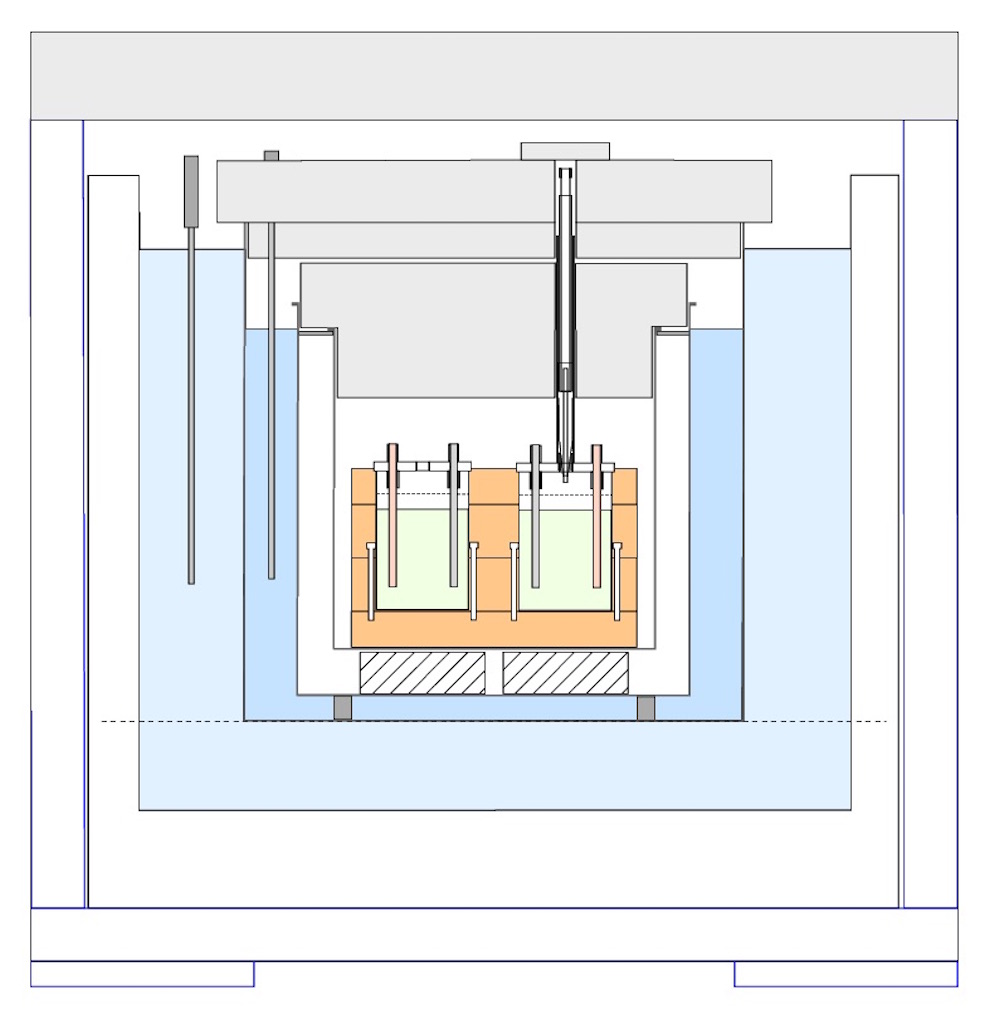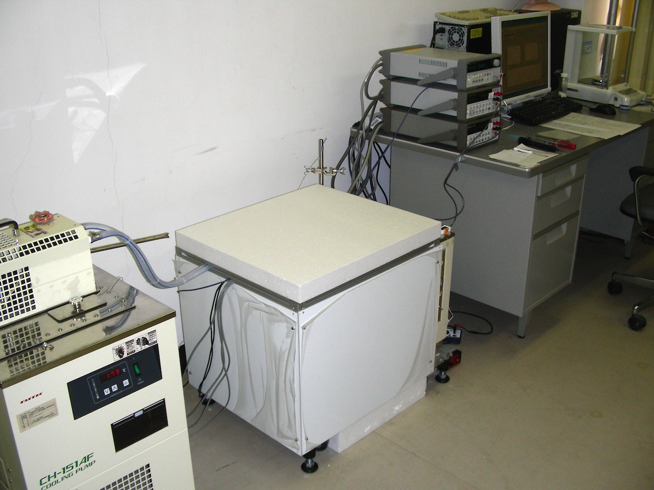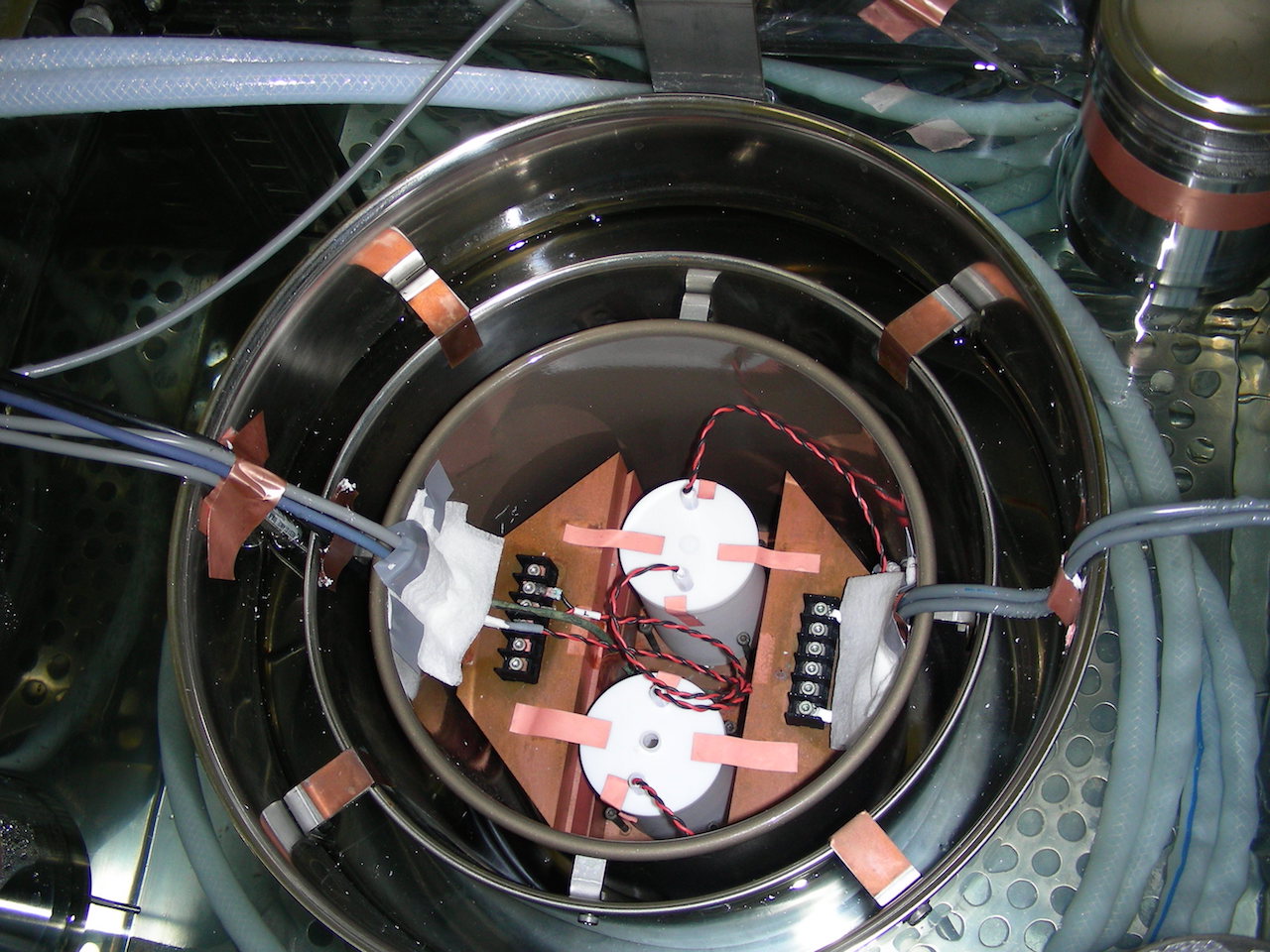 上が参照容器,下が反応容器.当研究室ではケイ酸塩のガラスや結晶のフッ化水素酸への溶解熱を測定しています.反応容器はテフロン製でヒートシンクは約10kgの銅ブロックです.検出器はテフロンコーティングされたステンレス容器に設置したのち,さらに断熱容器で二重に覆ったのち,恒温水槽に設置しています.
