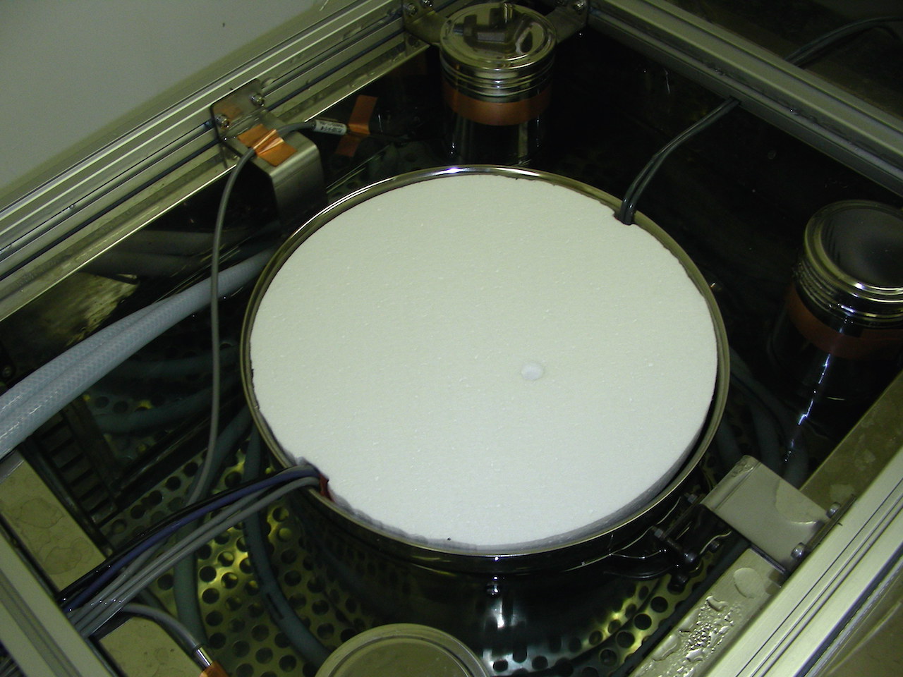 測定時はこのように発泡スチロールで三重に覆っています.試料投入は専用の試料投入管を使用して発泡スチロールに開けた小さな穴から行います.