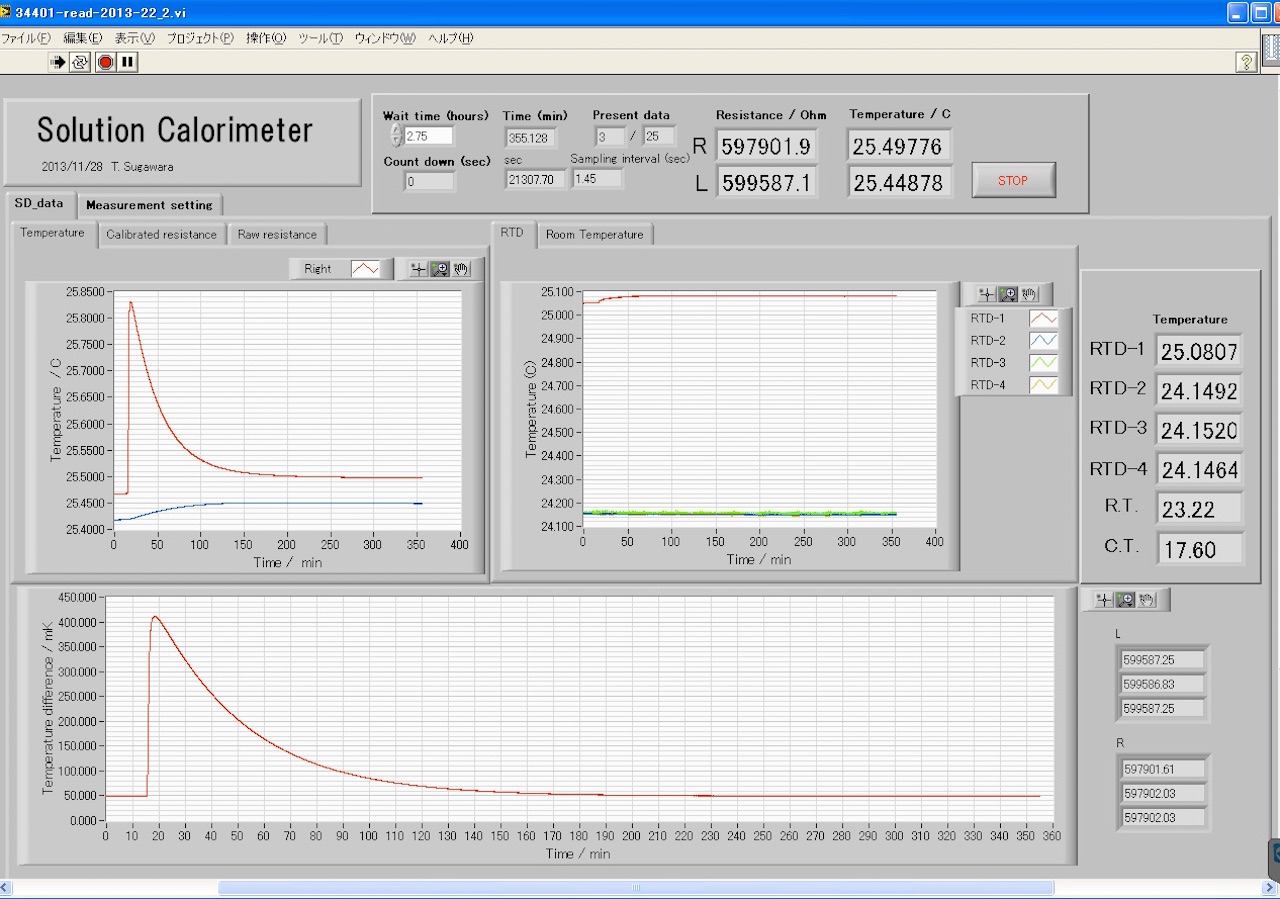 測温サーミスターは100kΩの抵抗6個を直列に接続したものをテフロンチューブに挿入したもので,隙間をシリコングリースで埋めています.抵抗値はAgilent 34401Aで読み取っています.キャリブレーションヒーターへの通電はAgilent 3410Aにより行います.いずれもパソコンにGPIB接続されており,LabViewで制御しています.