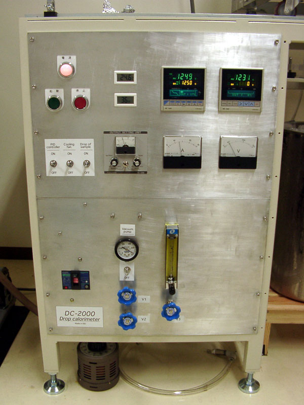 熱量計上部の加熱炉です.シリコニット製の既製品加熱炉を改造し,棒状のLaCr2O4発熱体(ケラマックス)に交換してあります.ケラマックスはSiCと比較してより高温(‾1800℃)までの加熱が可能で,適切に使用すれば劣化も少なく長く使用することができます.私は2005年以来100回以上の昇温を行っていますが,加熱能力はまだ十分で発熱体は交換していません.