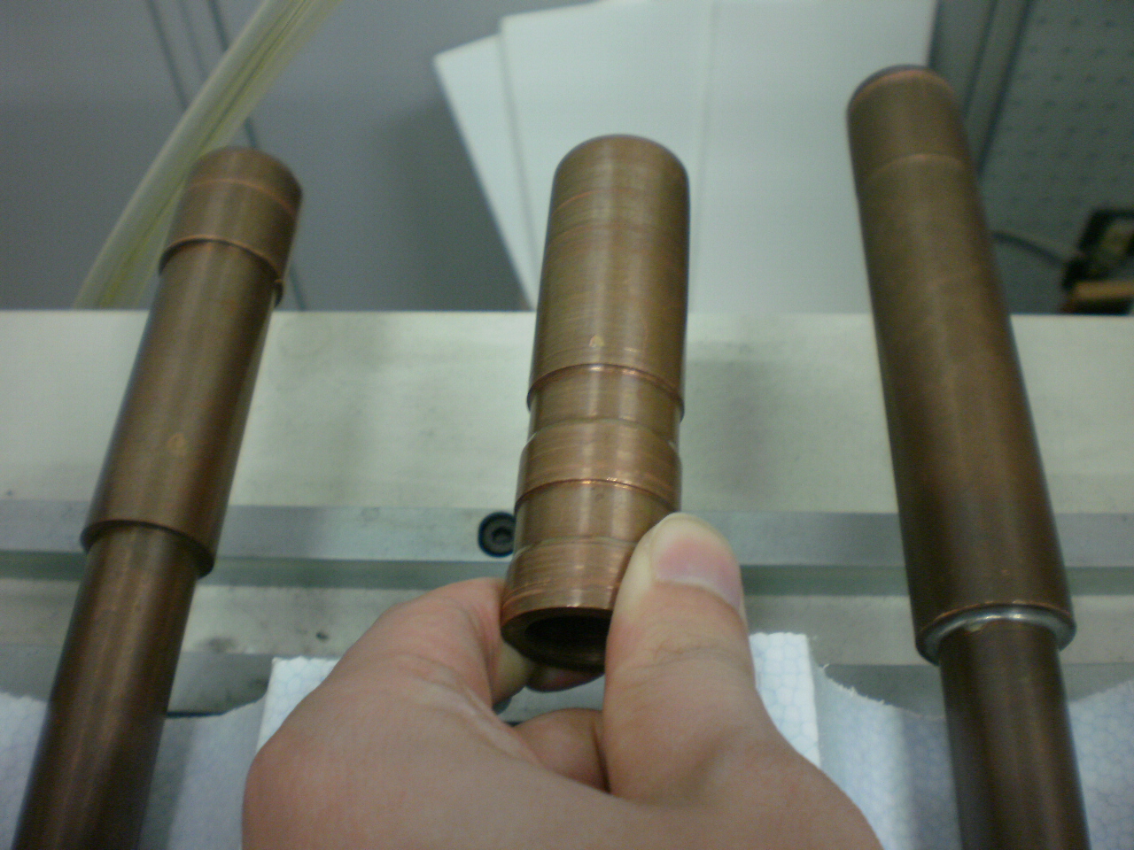 氷を形成させるための銅製の冷却管です.冷却管の構造の微妙な違いで氷のでき方も異なり,実験により使い分けています.