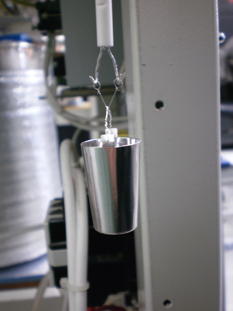 試料は長さ3cmのテーパー形状の白金ツルボに入れ,写真のように直径0.2-0.3mmの白金線で加熱炉の中央に吊るします.試料は加熱から15分以内に均一温度となります.その後,吊線に30V程度の電圧を加えて白金線を溶断してルツボは真下の熱量計に落下させます.