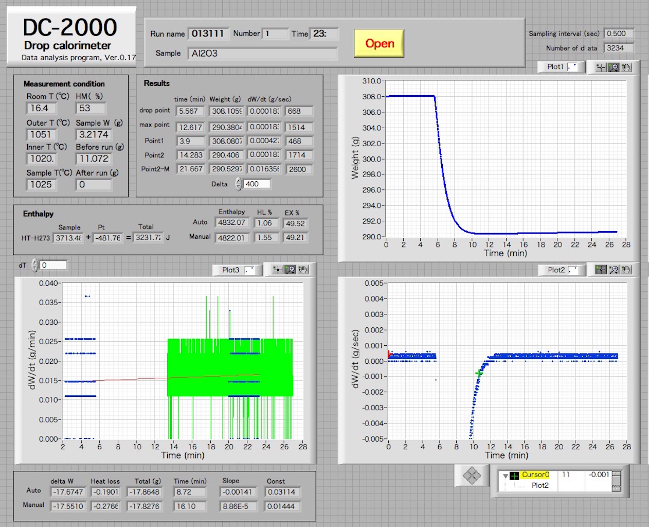 試料を落下させることで熱量計内部の氷が融解して体積が収縮し,それを埋め合わせる量の水銀をビーカーから吸い上げて減量している様子が測定されています.測定前の氷の形成も含めて一回の測定は40〜50分程度で完了します.