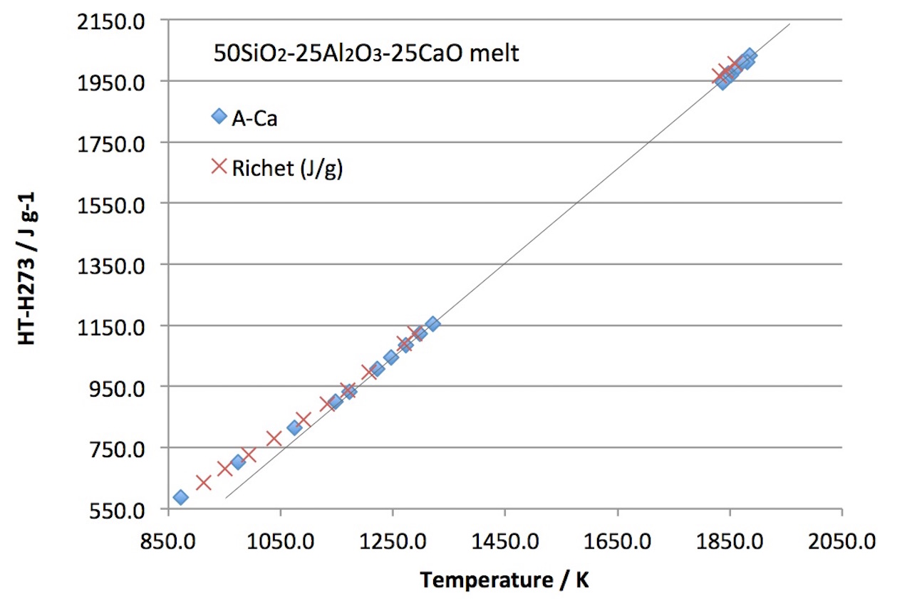 Richet and Botting (1984a)と比較してメルトの相対エンタルピーがやや高いのは,測定試料の量の違いに起因するガラスの仮想温度の差によるものです.測定から得られる熱容量(エンタルピープロットの傾き)はRichet and Botting (1984a)とよく一致しています.